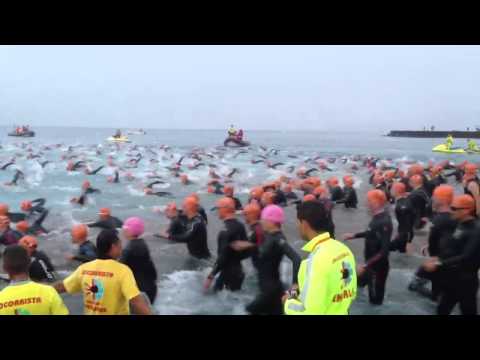 Corro hasta que el agua me llega a la cintura y entonces, de cabeza. Recuerdo una nube de pies que batían delante mía. Sin embargo no recuerdo muchos golpes, al menos no más que en cualquier otro triatlón. Supongo que por la posición de salida que elegí la gente estaba más tranquila, gente que quería hacer un agua tranquila sabiendo que el día sería largo.